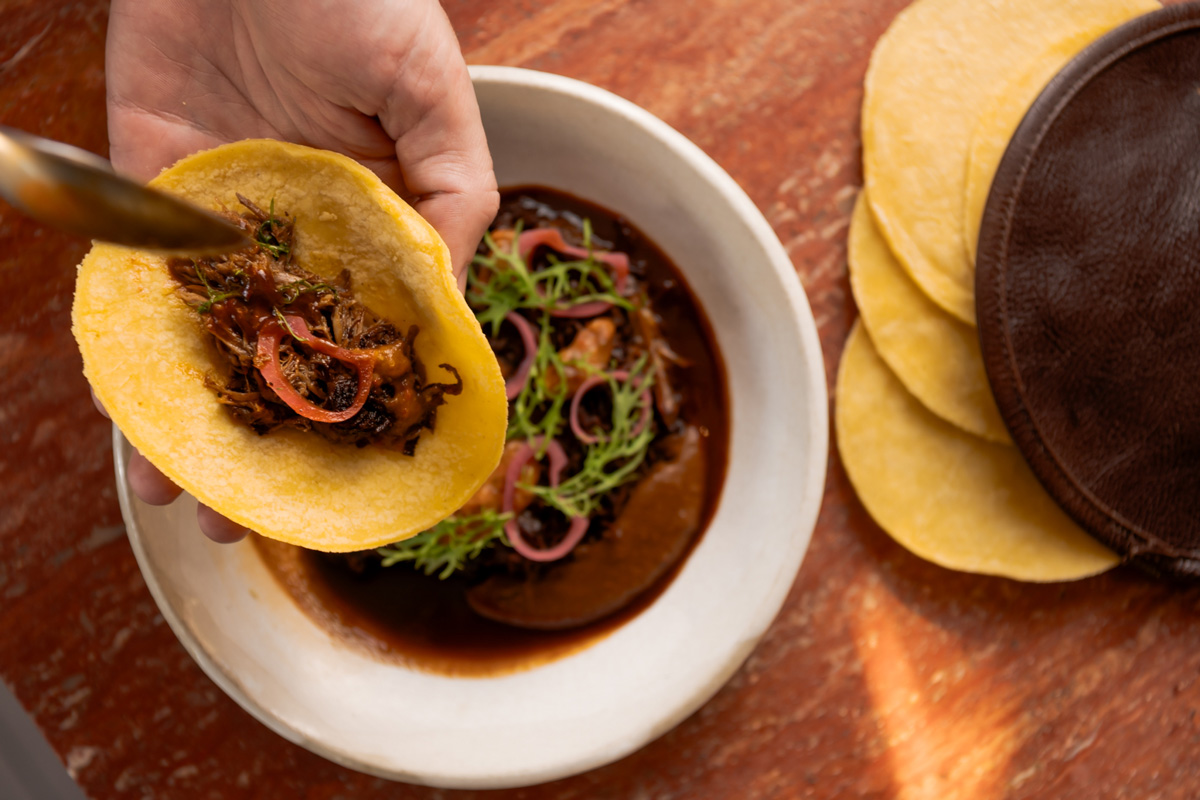 And for a true winter feast, the Goat Barbacoa. Whole goat cooked overnight and served with aromatic consommé, miso black beans, charred salsa and pickled eschallot. It’s rich, aromatic and perfectly spiced.